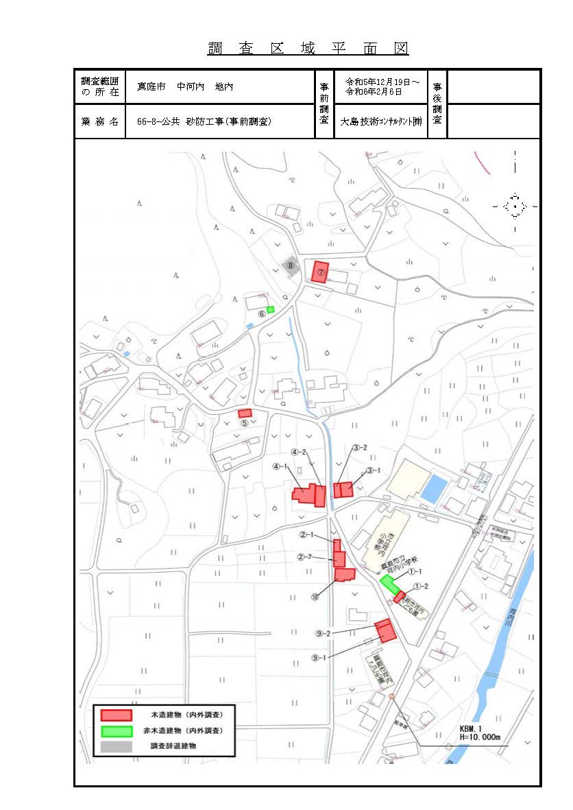 本工損調査業務は、急傾斜指定地湯本地区の公共急傾斜地崩壊対策工事に伴い、施工地周辺の建物等の影響を把握するために、木造建物4棟、非木造建物3棟、井戸の調査2ヶ所、水質分析・飲料水調査2資料の工損事前調査をおこなった。事前調査をおこなうにあたり、1.建物調査は、内部・外部の損傷の状況を確認し、認められた損傷の写真撮影をおこなった。2.傾斜測定は、建物の主要な部屋の柱及び通し柱・敷居等の傾斜を測定をした。3.レベル測定は今回の工事に影響が少ない箇所に測点を設置し、建物の四隅の基礎や敷地内の外構等の高さを測定した。